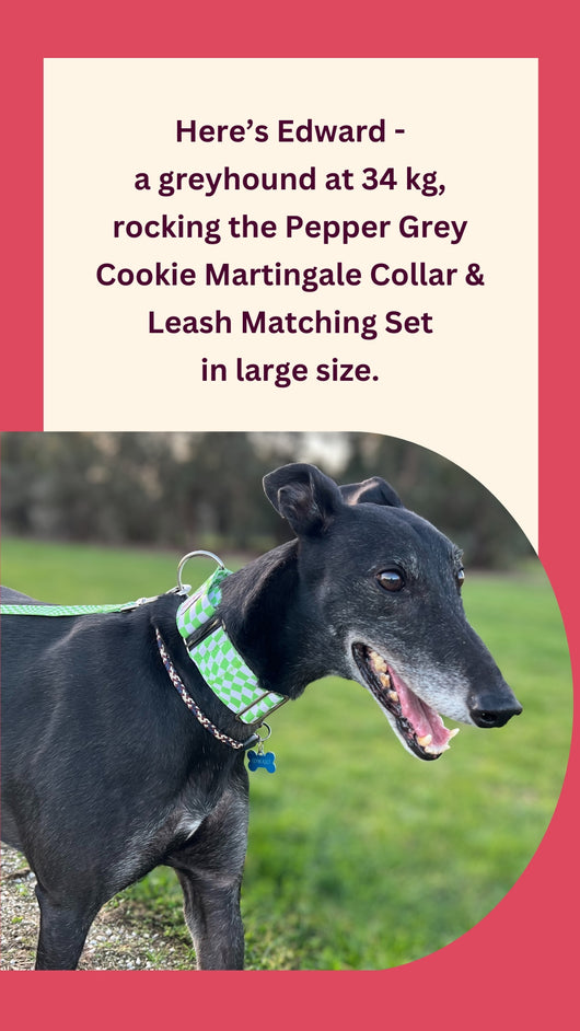 Brighten up your walks with our Cookie Collar & Leash Set 🍪💚. Designed in a playful green and white wavy check pattern, this set adds charm and comfort for greyhounds, whippets, and Italian greyhounds. Made for daily strolls and durable enough for zoomies!